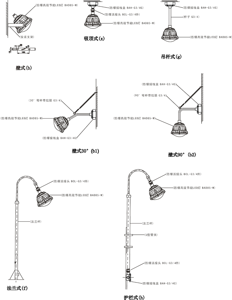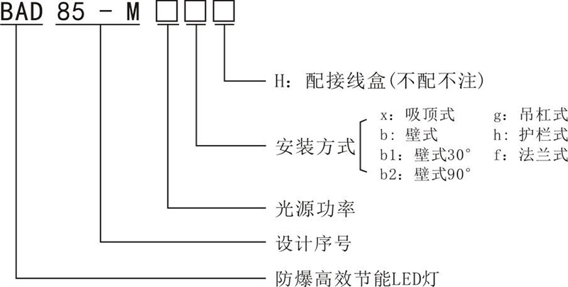 > 按照產(chǎn)品型號規(guī)格說明逐條選擇并注明防爆標志,例如:需要防爆高效節(jié)能 LED 燈 100W 規(guī)格,吸頂式安裝,則產(chǎn)品型號為 BAD85-M100x ExdembⅡCT5 Gb。