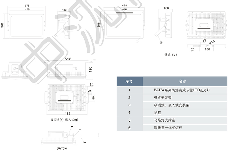 > ?按照產品型號規格說明逐條選擇并注明防爆標志,例如:需要防爆 LED 泛光燈 100W 規格,則產品型號為 BAT84-LED100;