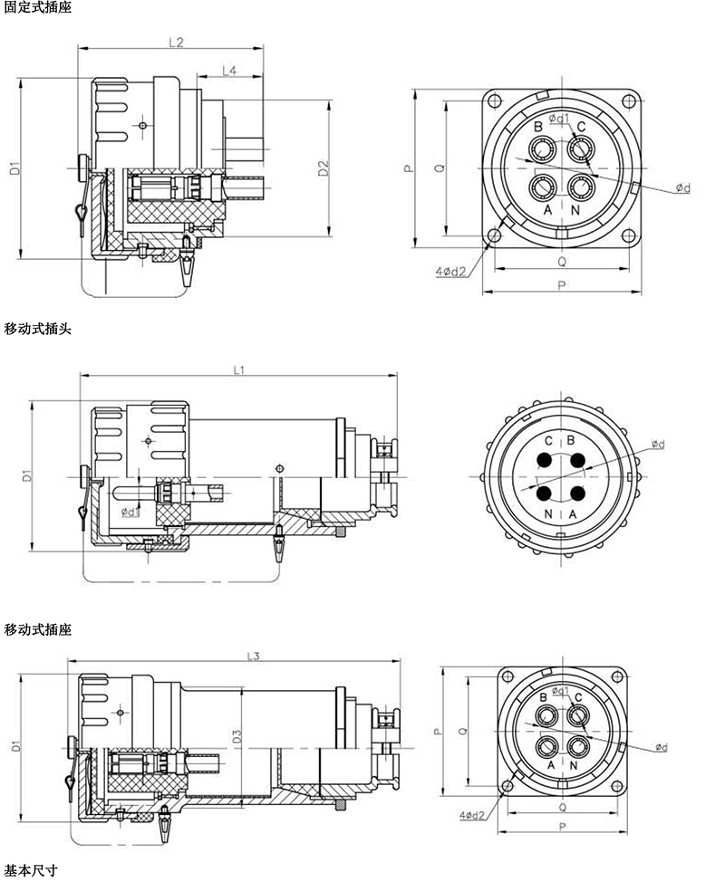 YT-GZ-4/60 | 60A/400V/500V | 3P+N | 60A 固定式三相五極插頭插座 |