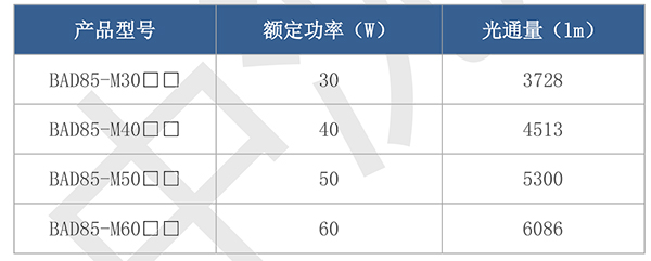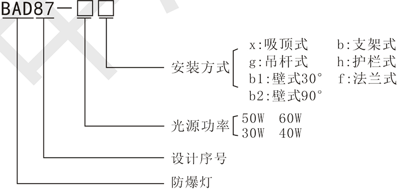 > 按照產(chǎn)品型號規(guī)格說明逐條選擇并注明防爆標(biāo)志,例如:需要防爆 LED 燈 50W 規(guī)格,吸頂式安裝,則產(chǎn)品型號為 BAD87-50x ExdembⅡCT5 Gb。